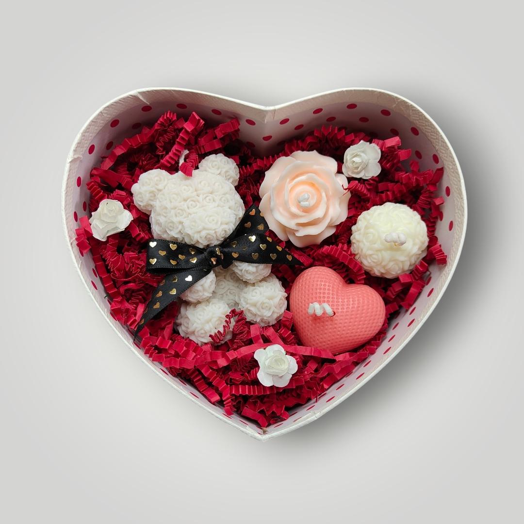 Un elegante cofre en forma de corazón con velas artesanales, perfecto para crear un ambiente romántico y especial.